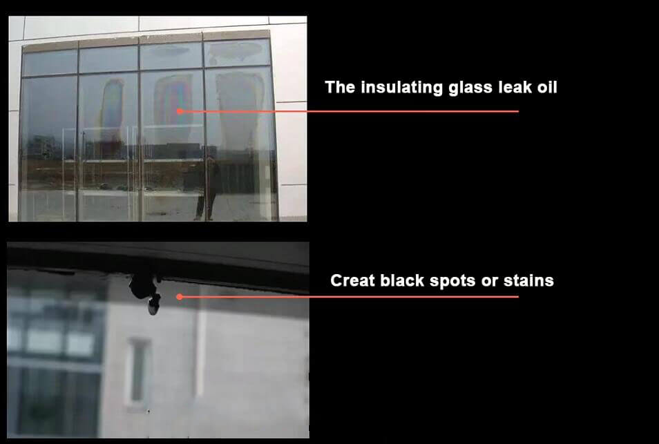 The widely used secondary sealant for insulating glass is silicone sealant. Some manufacturers replace a small amount of silicone oil with white oil to reduce costs. However, white oil can corrode the butyl sealant in the inner layer, leading to oil leaks and creating black spots or stains. These issues will result in seal failure.